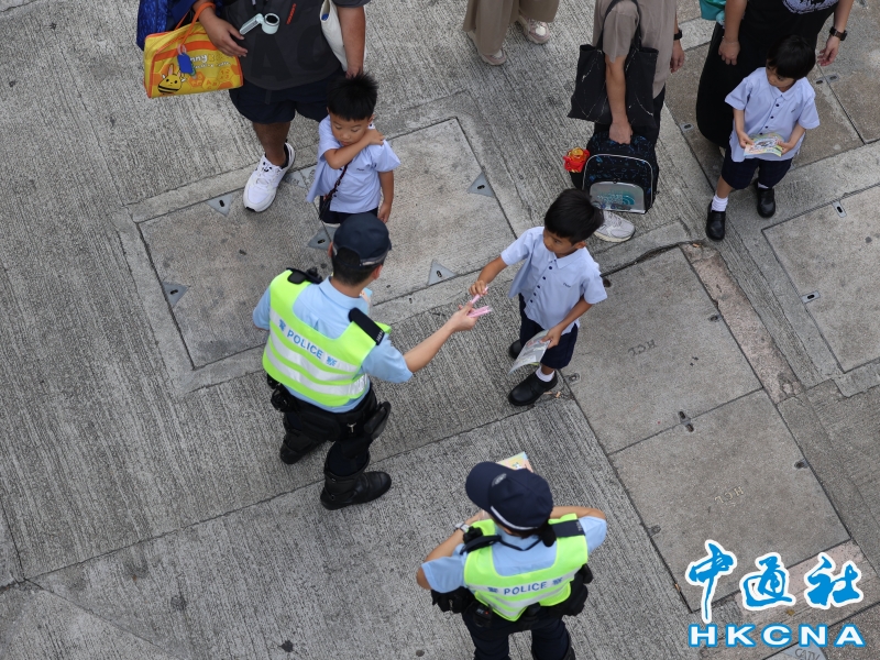 9月1日,警察在深水埗一所小學門前,向新入學的學生派發宣傳單張及文具。當天是香港開學日,教育局局長蔡若蓮表示,新學年會增加資源,為學生提供不同支援。(香港中通社記者 徐文峰攝) 香港中通社圖片