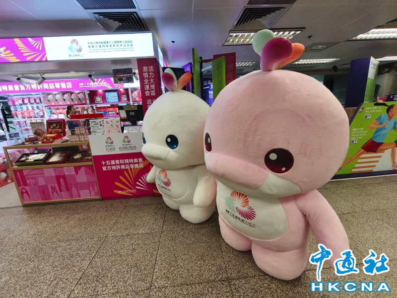位於香港灣仔的“全運會官方特許商品零售店”琳瑯滿目的全運會吉祥物上市供應。香港第十五屆全國運動會設有官方特許商品零售店,目前位於啟德零售館、西九龍高鐵站以及灣仔的入境事務大樓。市民和旅客可以在這些地點購買第十五屆全運會的官方紀念商品,如吉祥物毛絨玩具、徽章、盲盒等。 香港中通社圖片